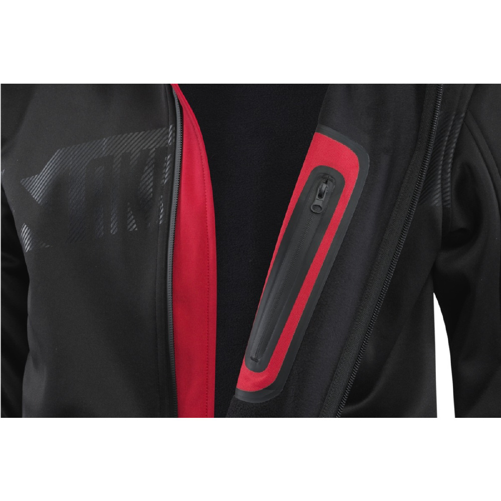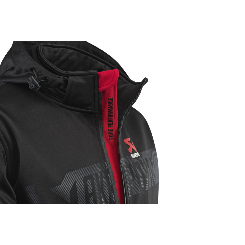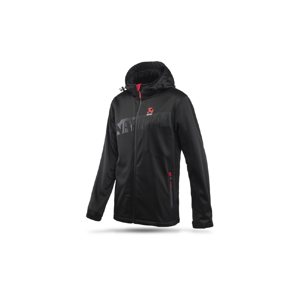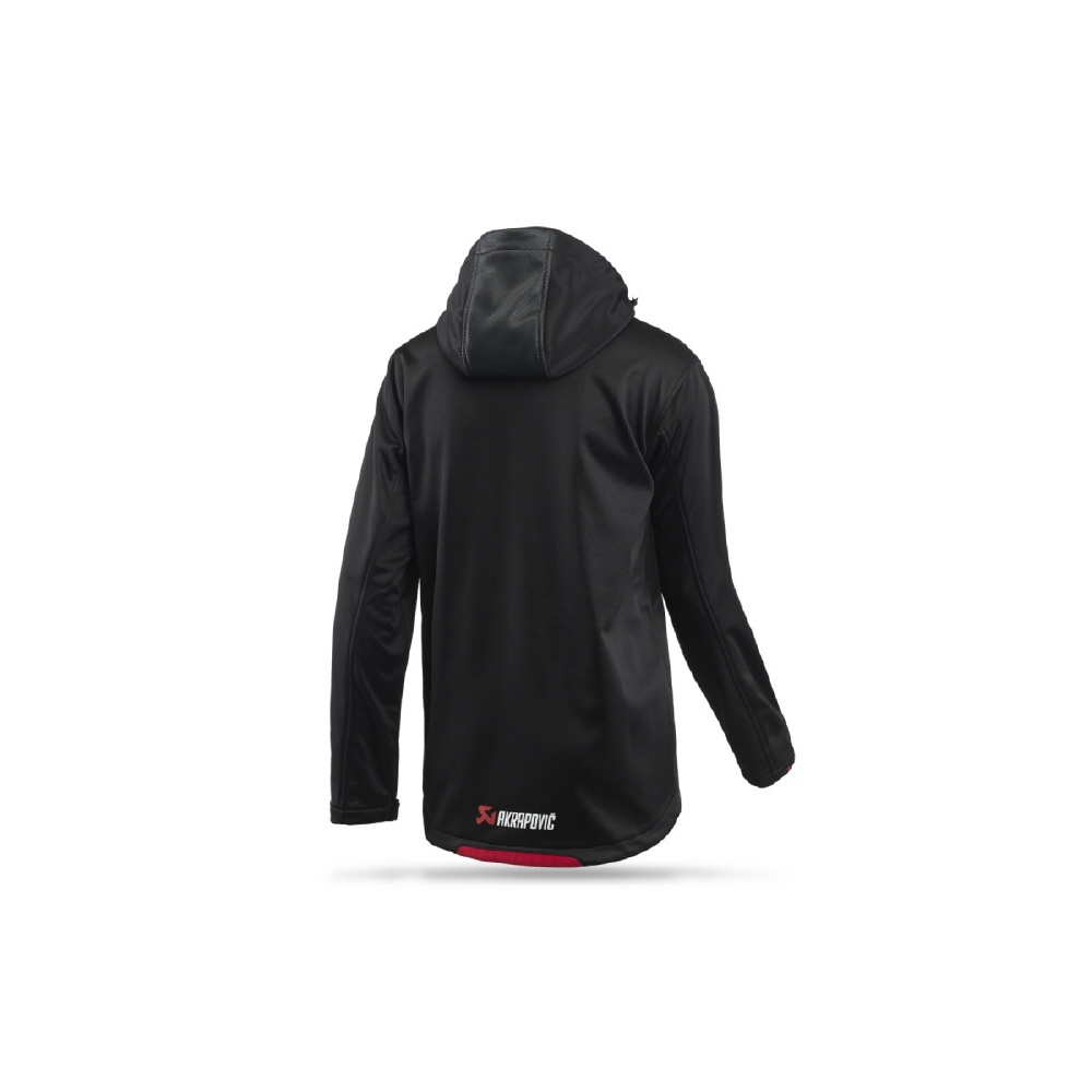 アクラポビッチ製のオフィシャルソフトシェル生地のジャケットです。バイクに乗る時など、フードは必要に応じて取り外しが可能です。