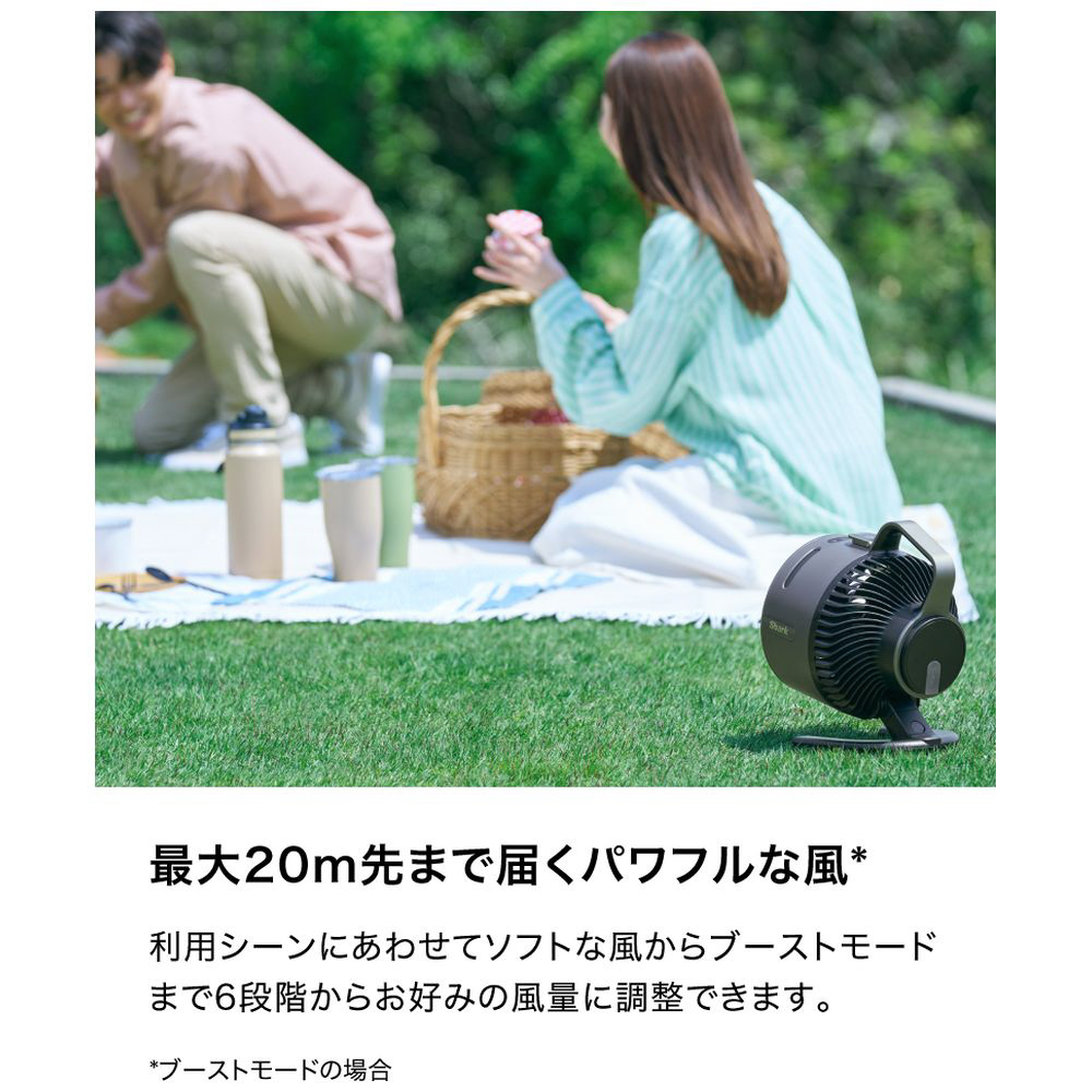 ■コンパクトなのにパワフル。利用シーンにあわせてソフトな風からブーストモードまで6段階からお好みの風量に調整でき、最大20m先まで風を届けます。