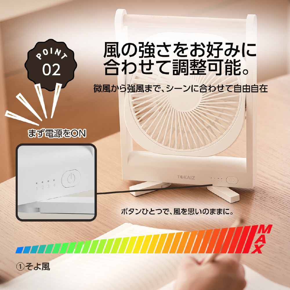 弱・中・強・超強の4段階風量調整に対応。ボタンひとつで簡単に切り替えられ、シーンに合わせた快適な風量を選べます。