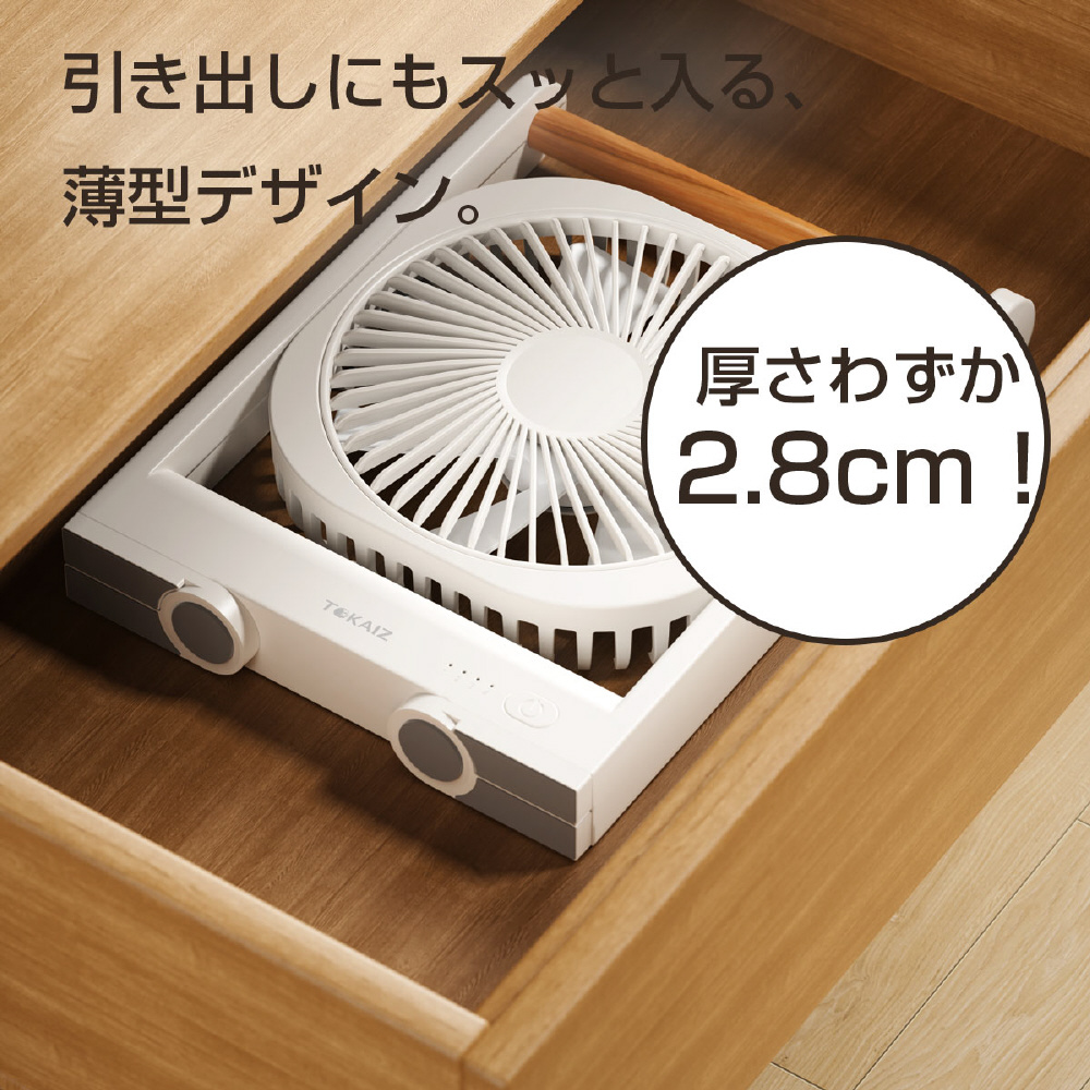 幅わずか28mmのスリム設計ながら、しっかりとした送風性能を実現。オフィス・車内・キッチン・脱衣所など、さまざまな場所で活躍します。