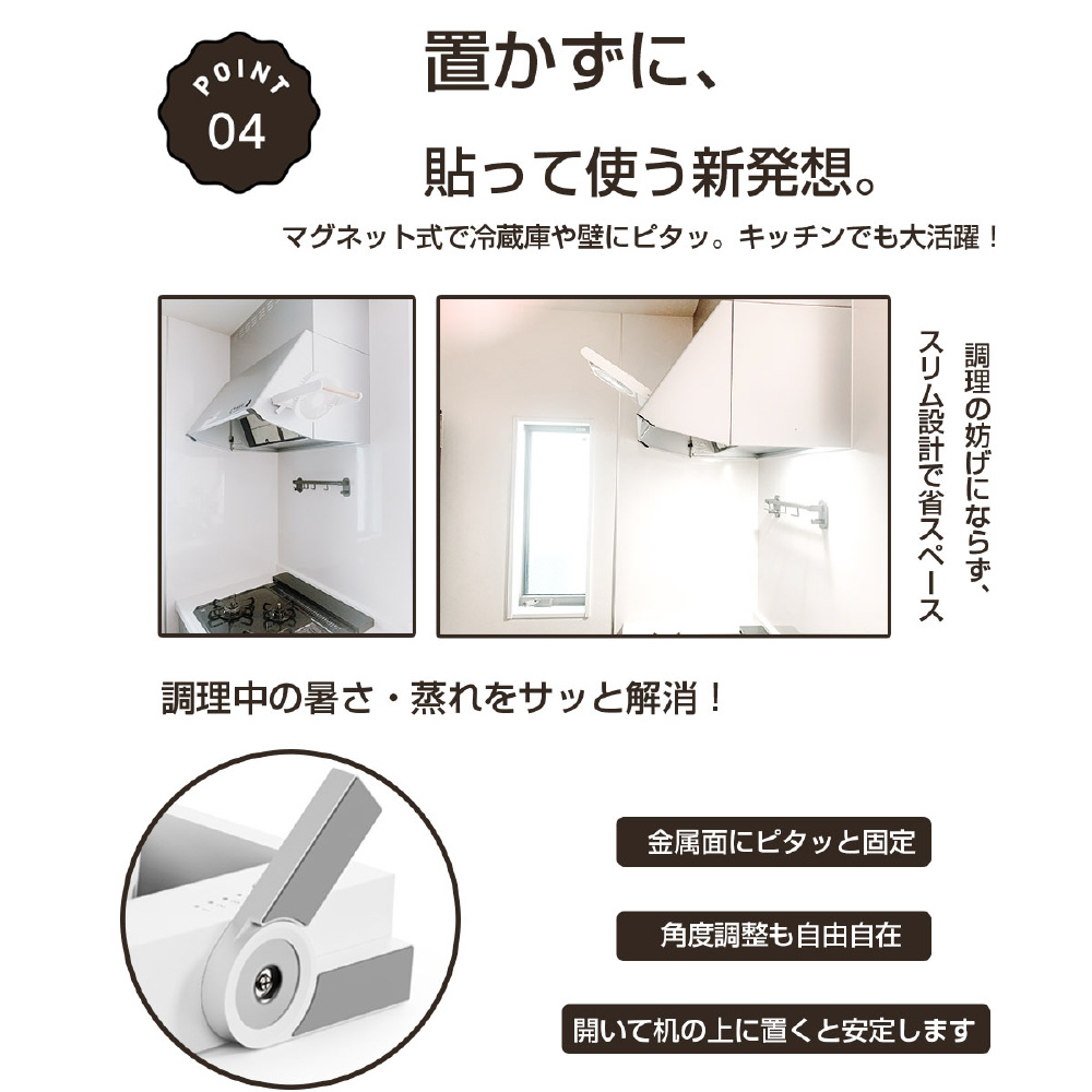 強力マグネットを搭載し、金属面にしっかり固定。軽量かつ静音設計で、デスクや寝室はもちろん、熱がこもりやすいキッチンでも快適に使えます。