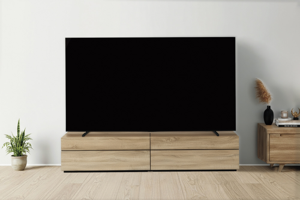 シンプルなストーンデザインと無垢板カラーのプレインモデル幅2000mmの~90V型対応テレビ台、ブレーカー付き3口タップ搭載