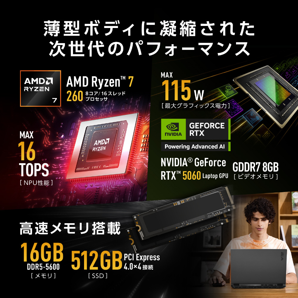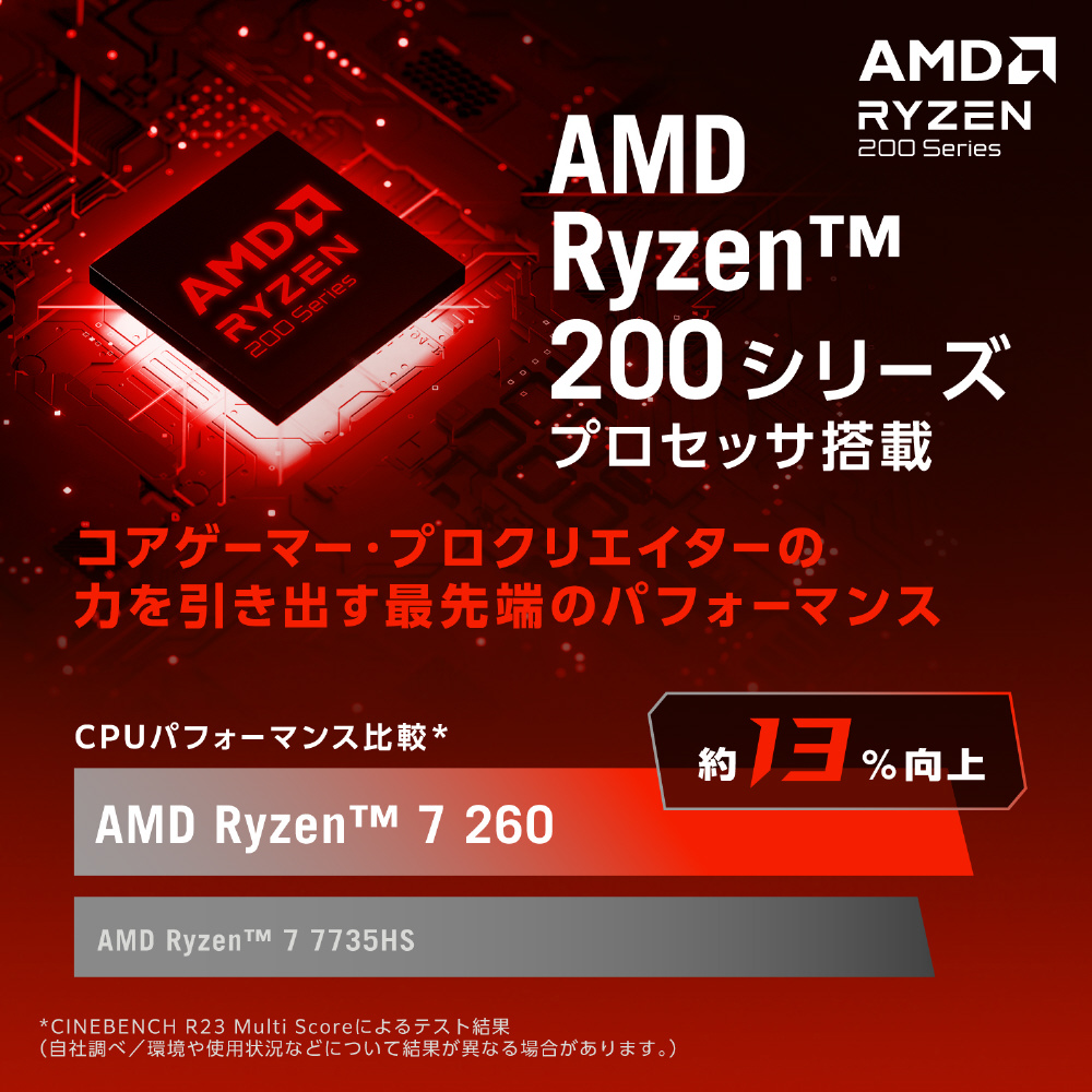 AMD Ryzen 7 260 プロセッサを搭載。優れた応答性、没入感あふれるグラフィックス性能、ローカルでのAI処理に対応するNPUを備えながら、ロングバッテリライフを実現。さらに、安定した動作を支える16GBメモリと、512GBストレージを搭載し、ゲームプレイ、タスクの同時実行、編集作業など、幅広い用途で活躍します。