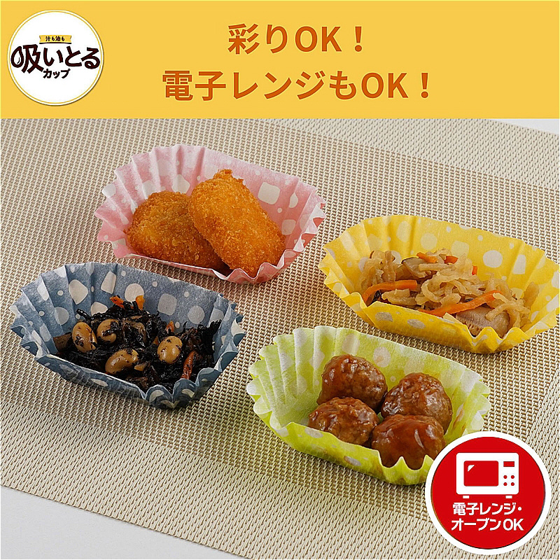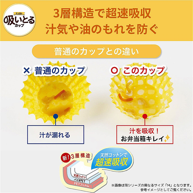 天然コットン使用の3層構造でしっかり吸収する「汁も油も吸いとる」おべんとうカップ。