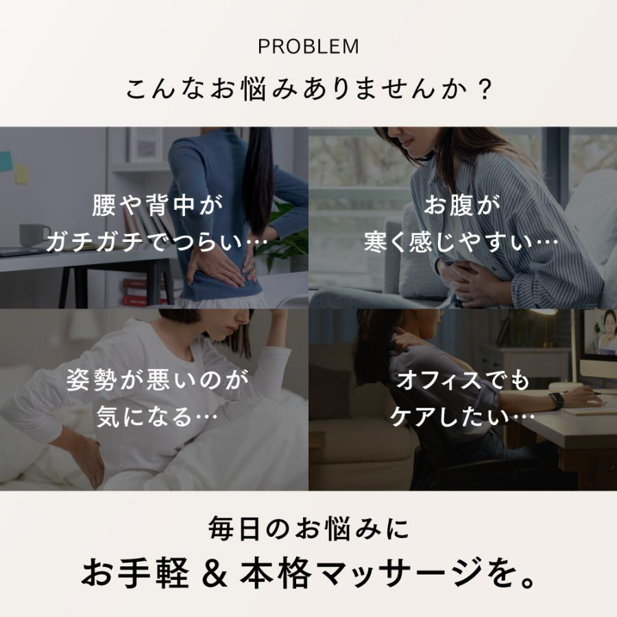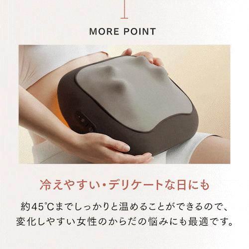 一台で、腰やお腹など全身をケアできる、コンパクトなコードレスマッサージャー。 本体表面には振動と温感機能を搭載。血行を促進し、お腹の日常的な不快感をケアします。