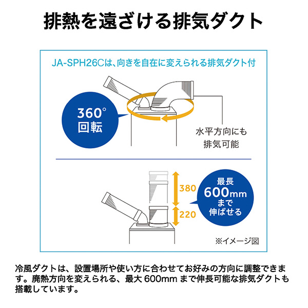 冷風ダクトは、設置場所や使い方に合わせてお好みの方向に調整できます。廃熱方向を変えられる、最大600mmまで伸長可能な排気ダクトも搭載しています。
