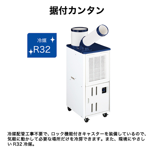 冷媒配管工事不要。またロック機能付きキャスターを装備しているので、気軽に動かして必要な場所だけを冷房できます。
