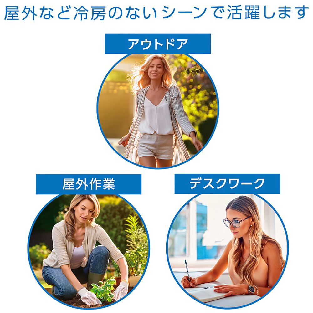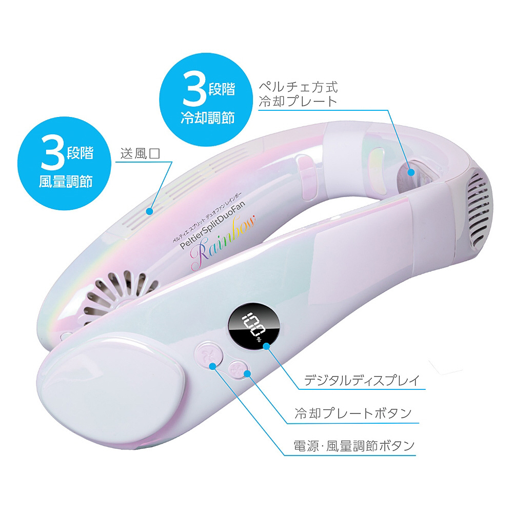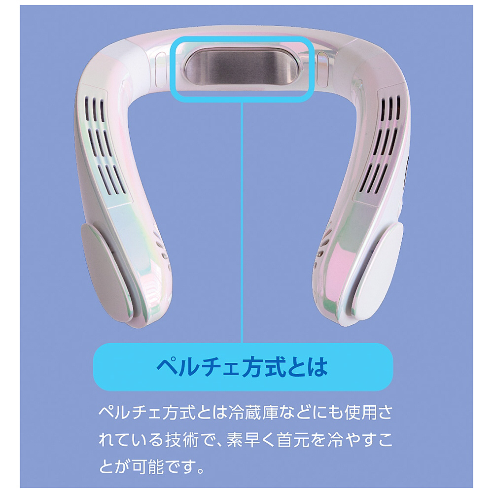 ペルチェ方式のプレートで素早く首元を冷やし、首周りに風を送るスプリット式を採用し屋外など冷房のないシーンで大活躍!