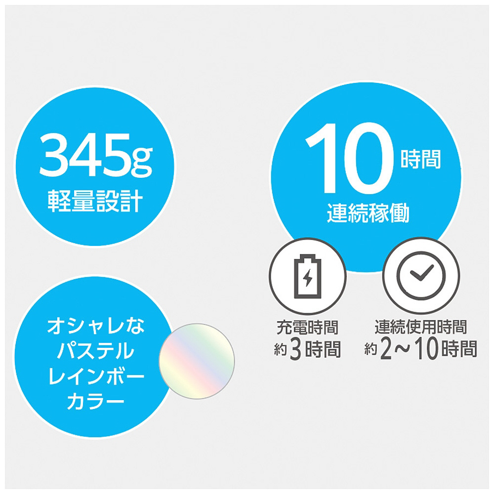 ■使用可能時間(ファン)弱風 約10時間・中風 約8時間・強風 約5時間