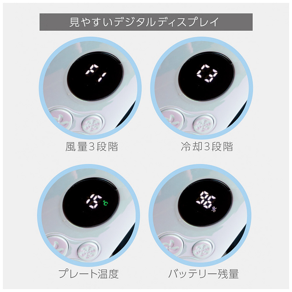 ■見やすいデジタルディスプレイにて、風量・冷却・プレート温度・バッテリー残量 表示