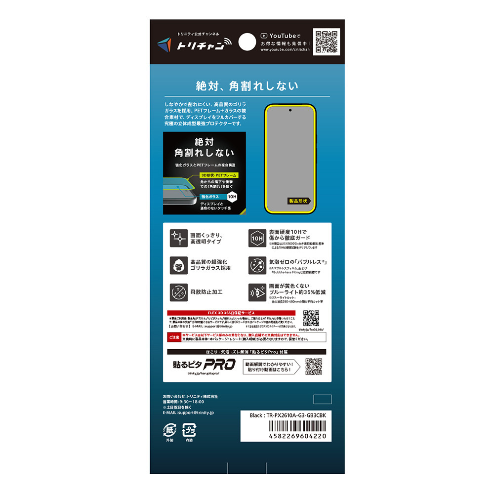 しなやかで割れにくい、高品質のゴリラガラスを採用。PETフレーム+ガラスの複合素材で、ディスプレイをフルカバーする究極の立体成型最強プロテクターです。