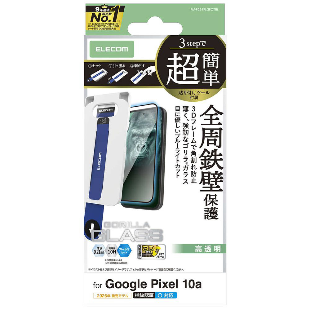 Google Pixel 10a ガラスフィルム フレーム付き ゴリラ 0.21mm ブルーライトカット 超簡単貼り付けツール