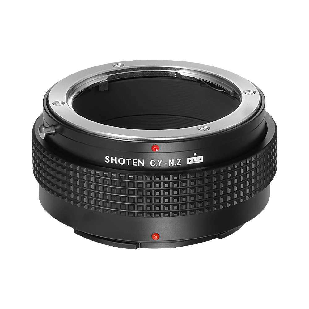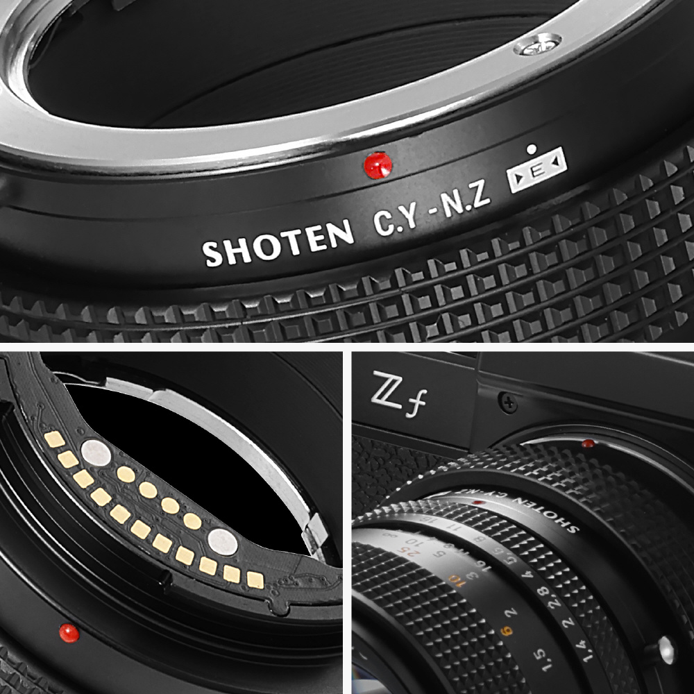 SHOTEN(ショウテン)CY-NZ-Eは、ヤシカ・コンタックスマウントレンズをニコンZマウントのカメラで使用するための電子接点付きマウント変換アダプターです。焦点距離や開放F値などのレンズ情報をカメラへ伝達し、EXIF記録およびフォーカスエイド機能に対応します(AFおよび自動絞り制御非対応)。オールドレンズを含む多彩なレンズ資産を、ニコンZマウント機でより快適に活用したいユーザーに適した製品です。
