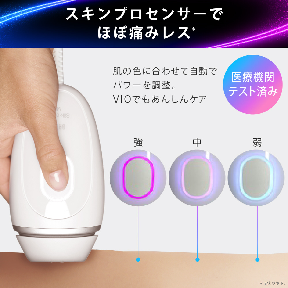 ブラウン史上最高峰のスキンプロセンサーは、肌色を読み取り、自動で照射パワーを調整することで、VIOのように見えづらい部位にも安心ケアを実現。医療機関テスト済みで、目にも安全: サングラス不要。