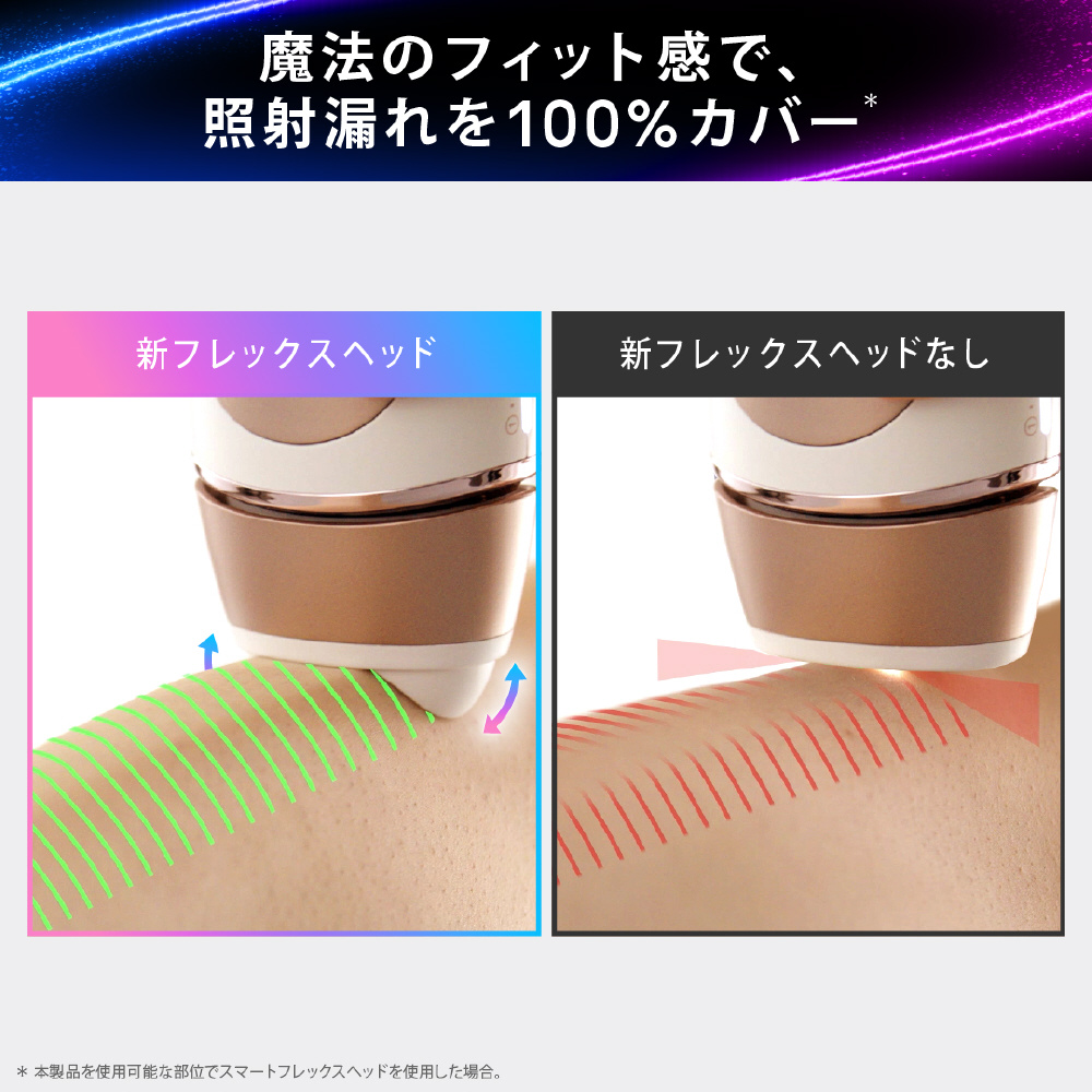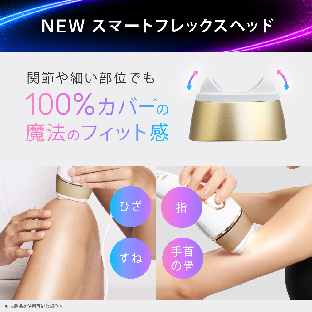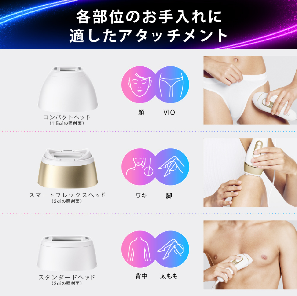 顔、体、VIOでも効果を実感。超やわらか・やわらか・通常の3つのパワーモードの選択と、付属ヘッドが各部位のお手入れを最適化。関節や細い部位にも100%カバーのスマートフレックスヘッドも搭載。医療機関テスト済み。