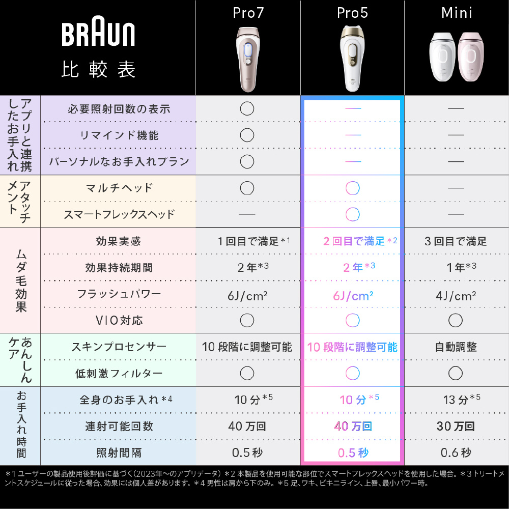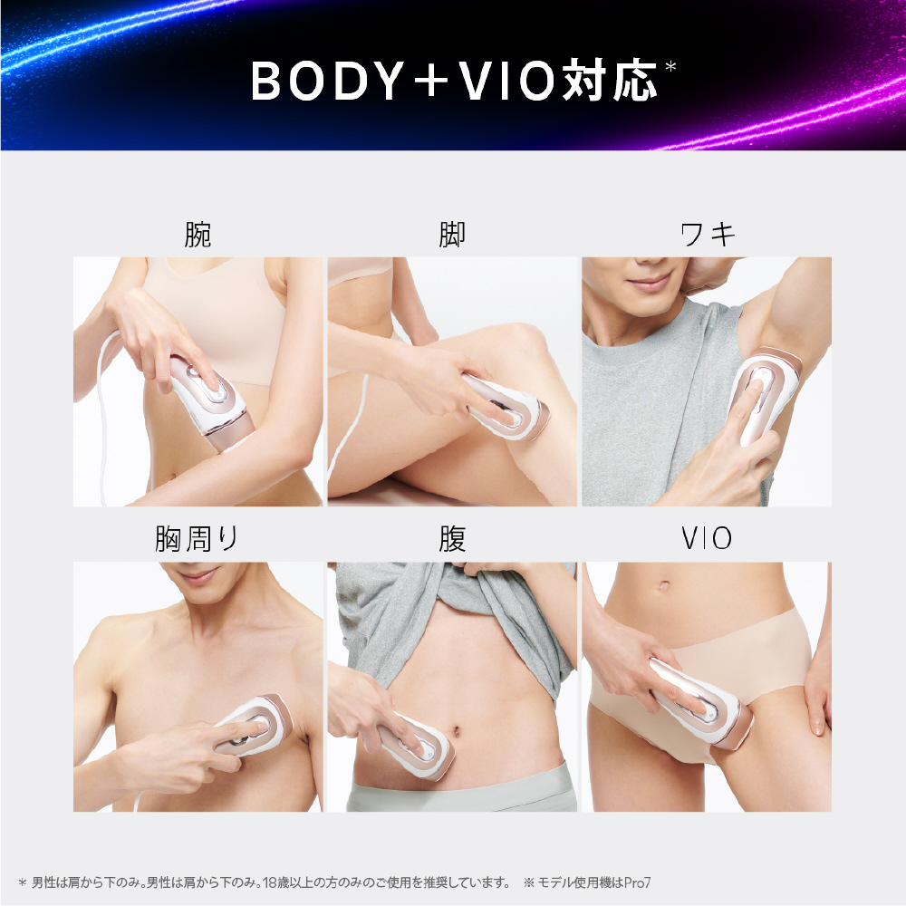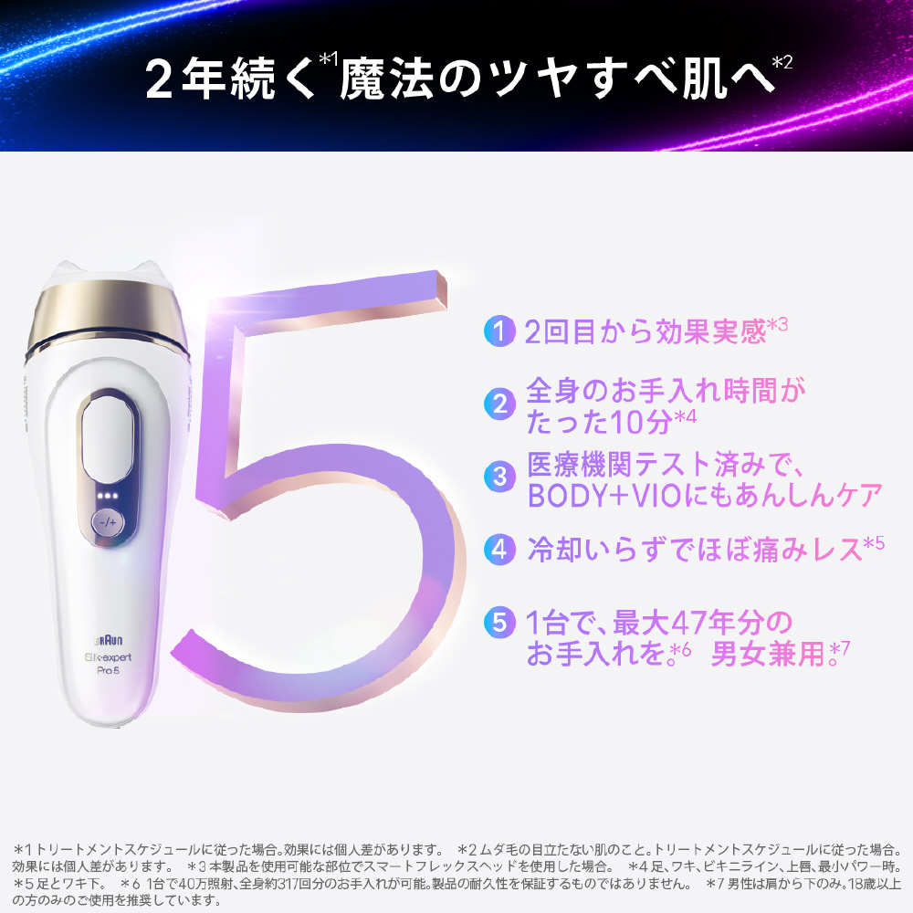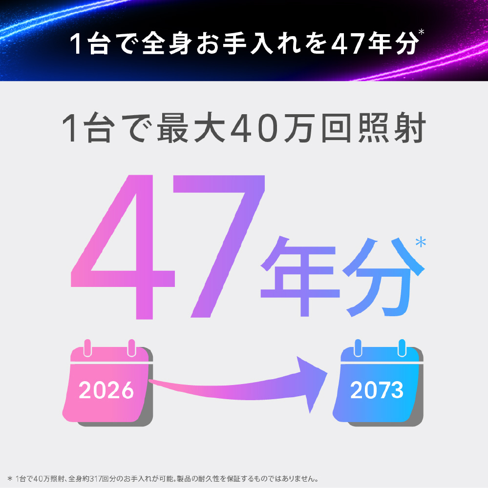 (※1:ユーザーの製品使用後評価(2023年11月-2024年4月のアプリデータに基づく)、(※2:脚、ワキ、ビキニライン、上唇、最小パワー時)、(※3:追加のお手入れが必要な場合は、取扱説明書をご参照ください)