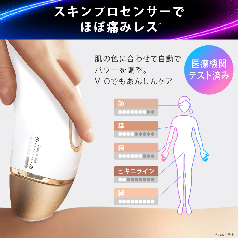 ブラウン史上最高峰のスキンプロセンサーは、肌色を読み取り、自動で照射パワーを調整することで、VIOのように見えづらい部位にも安心ケアを実現。医療機関テスト済みで、目にも安全: サングラス不要。