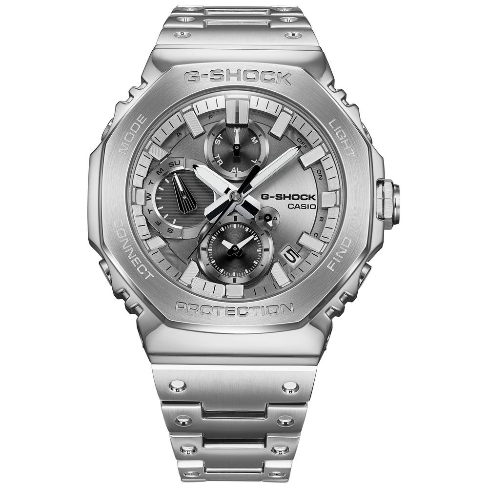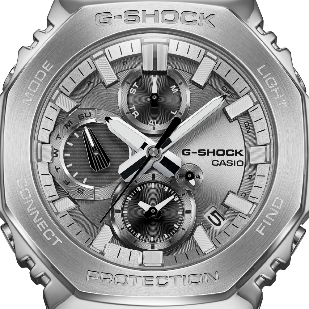DW-5000Cの八角形フォルムを受け継いだフルメタルクロノグラフ、GMC-B2100シリーズから、シルバーメタリックの蒸着ダイアルにブラックのインダイアルを配し、モノトーンのスポーティな表情を際立たせたモデルが登場します。