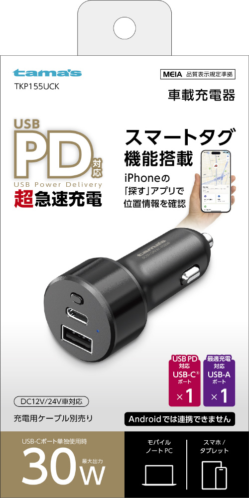 スマートタグ機能付PD30Wカーチャージャー C+A 多摩電子工業 ブラック TKP155UCK