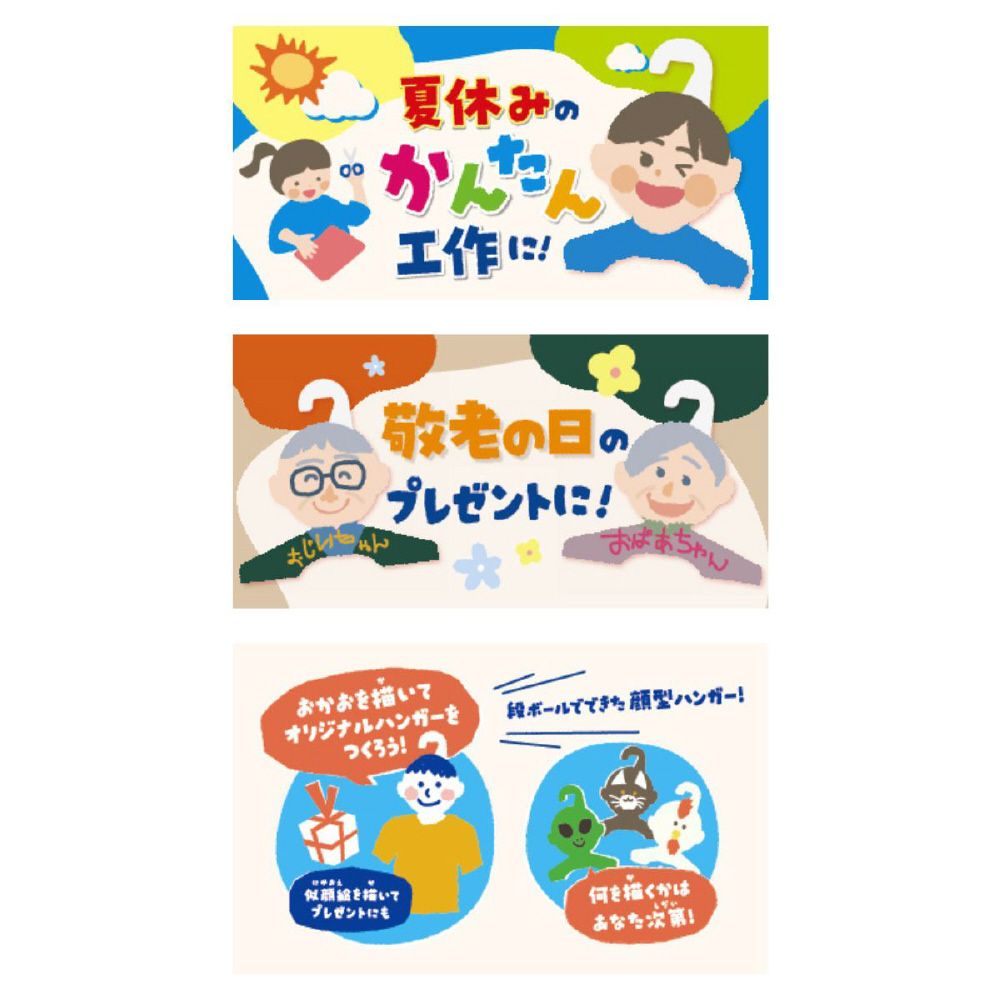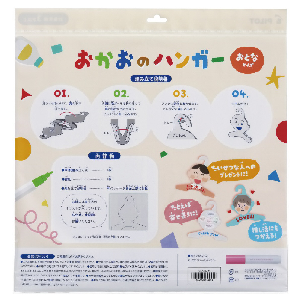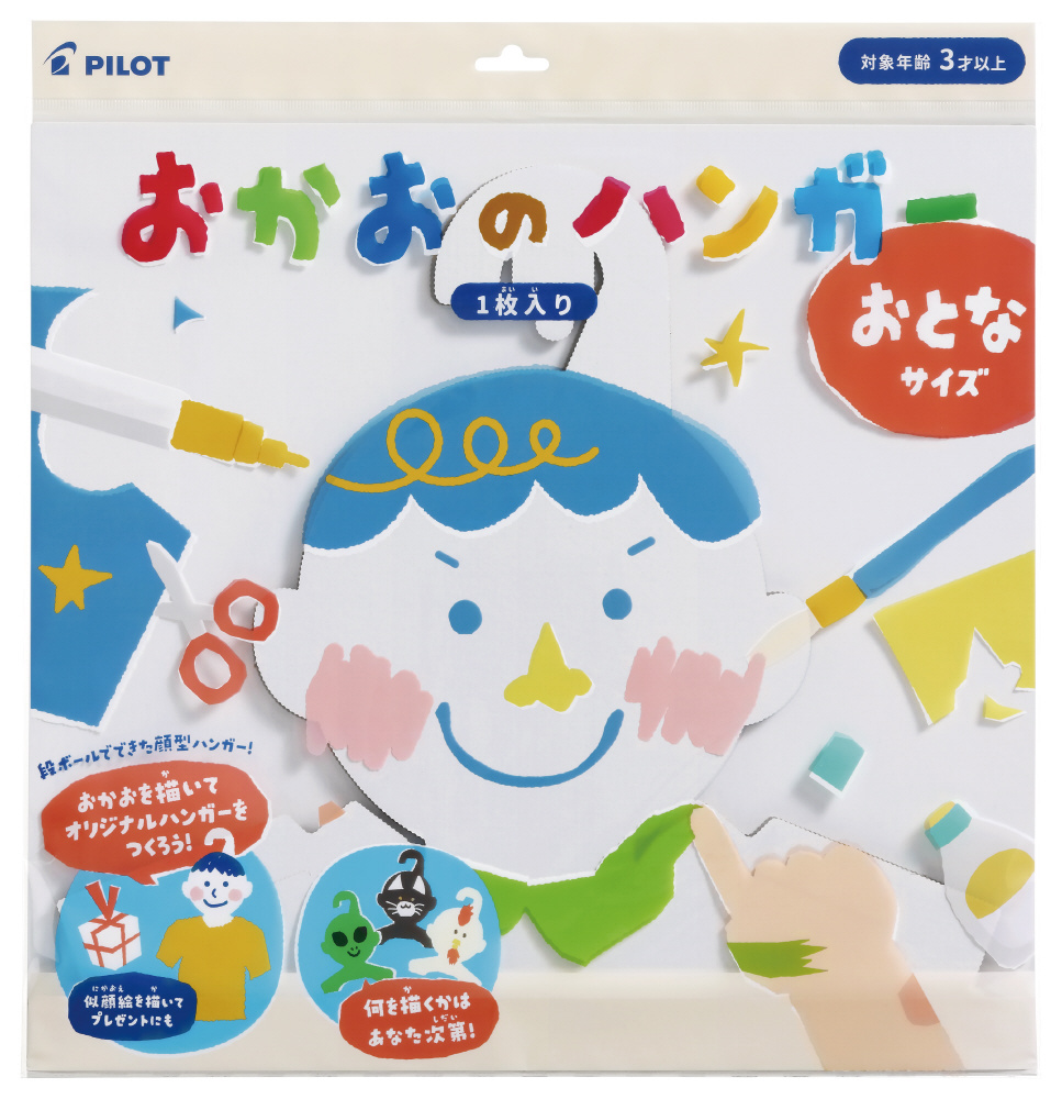 段ボールでできた顔型のオリジナルハンガーです。自由に塗料やペンを利用して「おかお」を描くことができます。描き終えたらハンガーとして使ったり、飾ることができます。親子で似顔絵を描き合い、お互いにプレゼントしたり、母の日や父の日、敬老の日といったギフトシーン、夏休み・冬休みなどの工作、さらには大人の「推し活」や寄せ書きなど、幅広いシーンでお楽しみください。