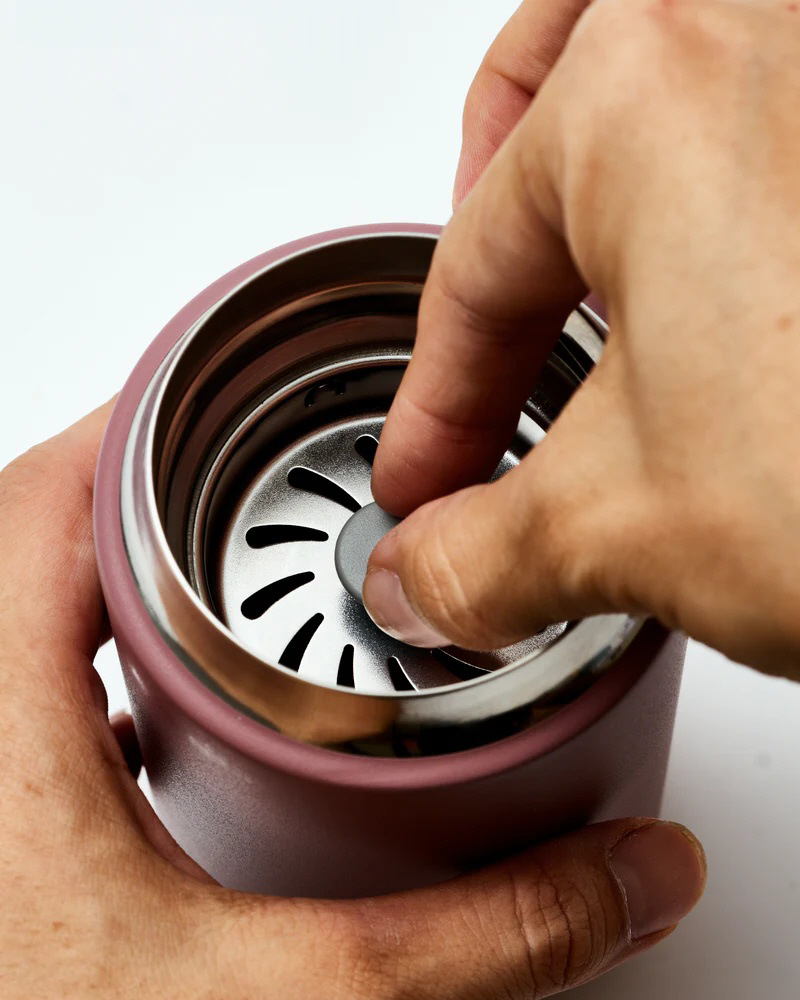 ・飲み口部分に専用のスプラッシュガードをはめるだけで持ち運び中に氷やドリンク、ティーバッグなど中身が飛び出すのを防ぎます。また、ワイングラスを模した薄いリップは口当たりがよく、コーヒーのアロマや味わいをダイレクトに感じられるため、どこでも淹れたてのおいしいコーヒーを楽しむことができます。