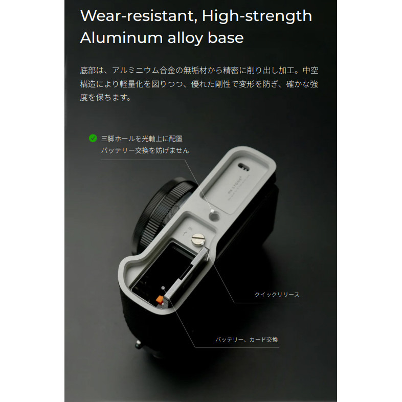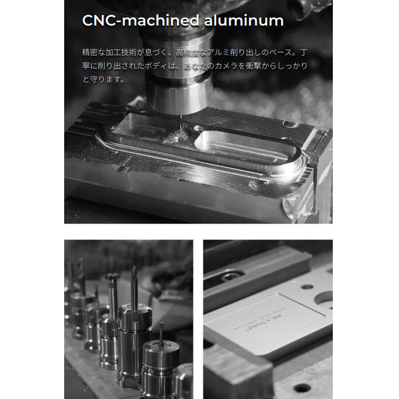 コンピュータによる数値制御(CNC)で削り出した底面ベース部分は、中空加工されたアルミ合金を使用し、軽量でありながら耐摩耗性に優れ、カメラを衝撃や傷からしっかりと守ります。