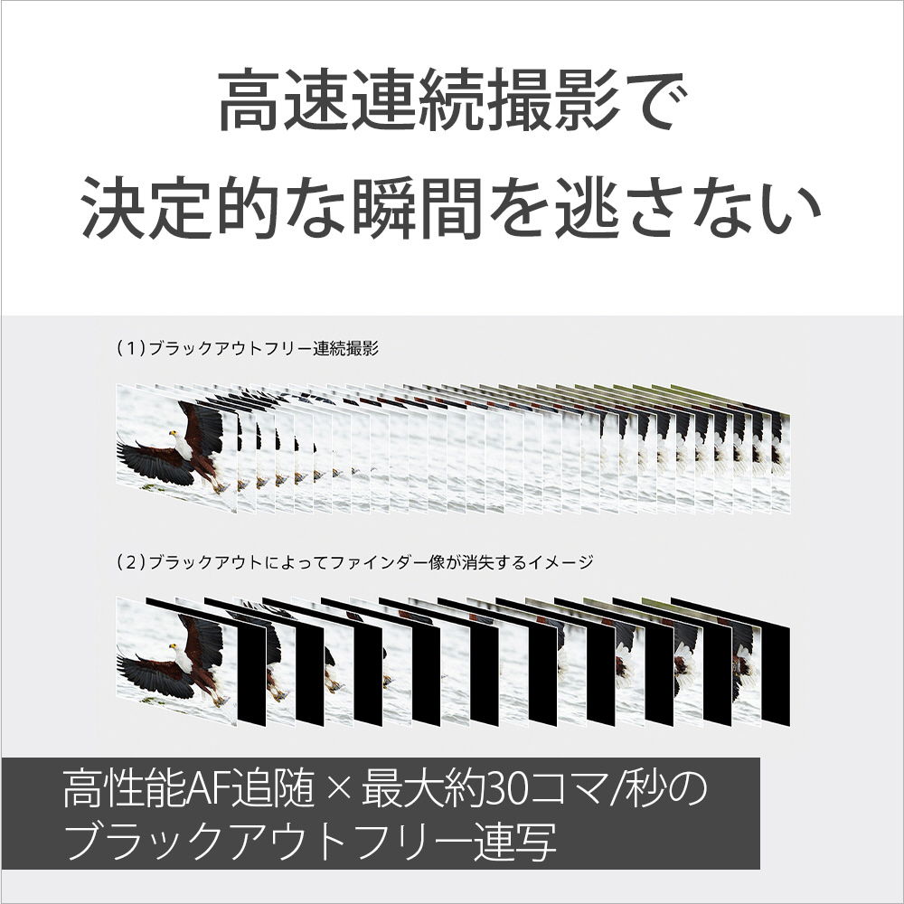 高精度なAI被写体認識を行いながら、最大約30コマ/秒のブラックアウトフリー高速連続撮影が可能です。