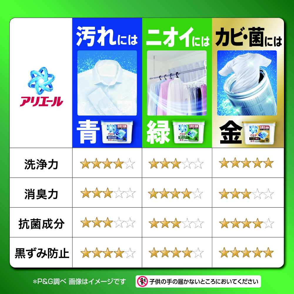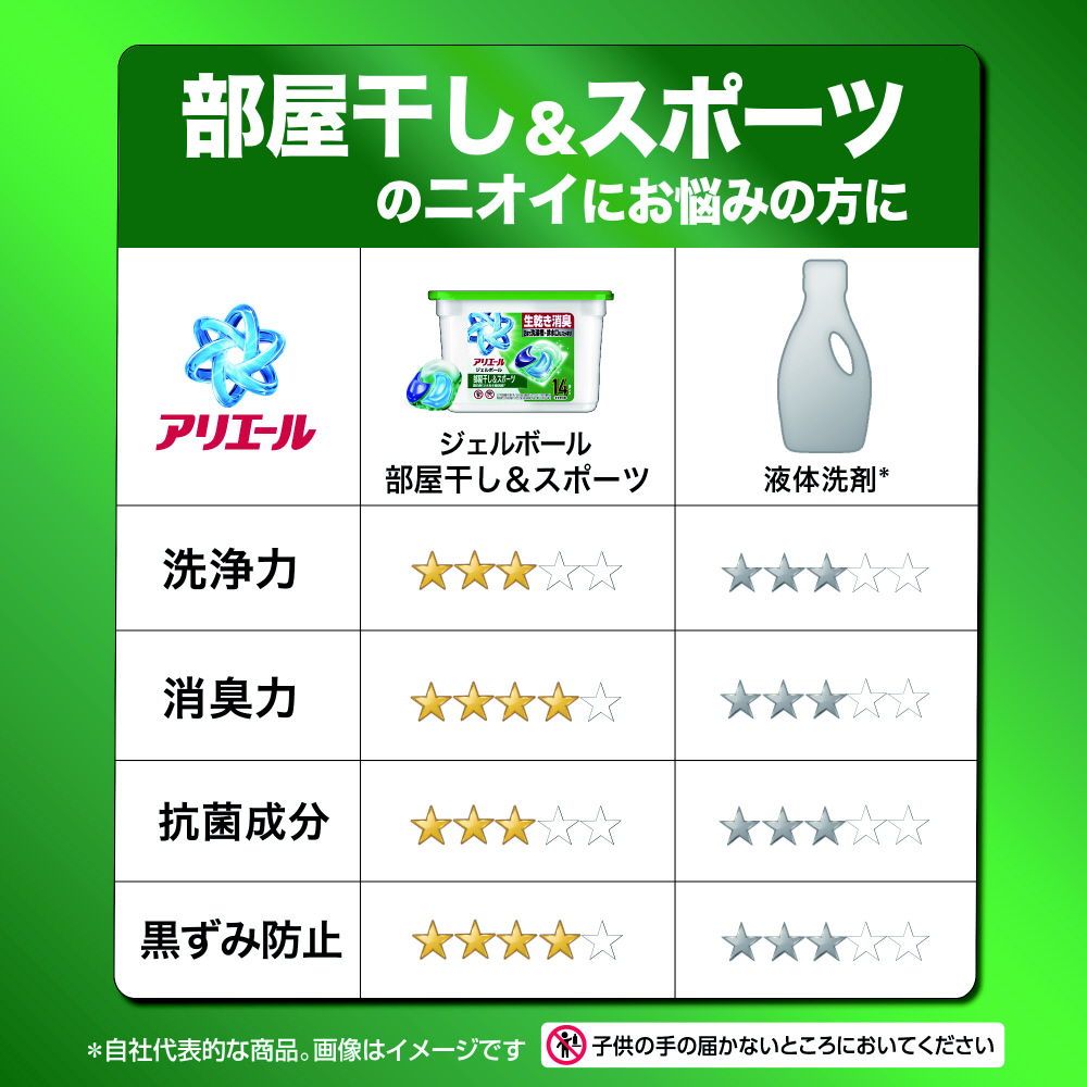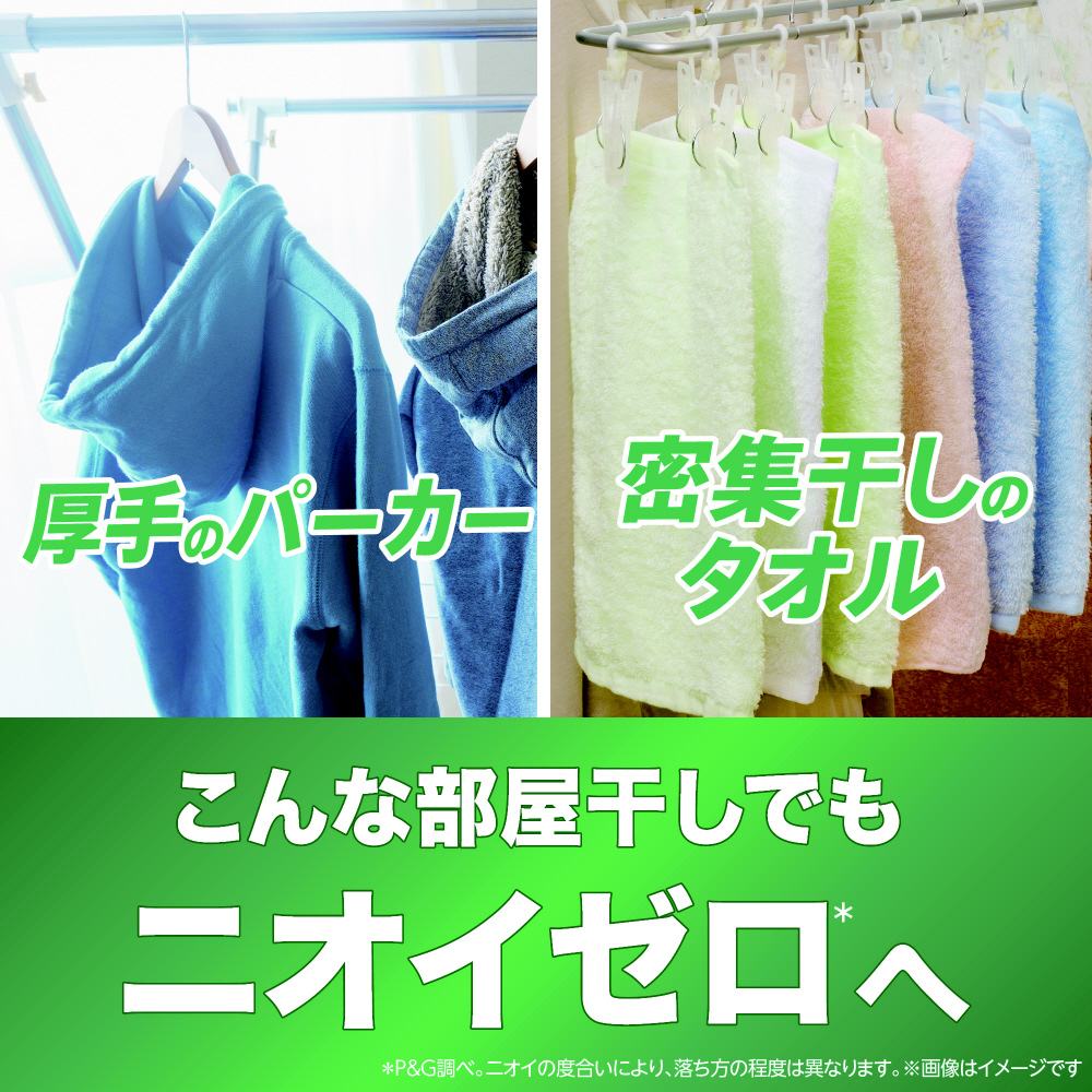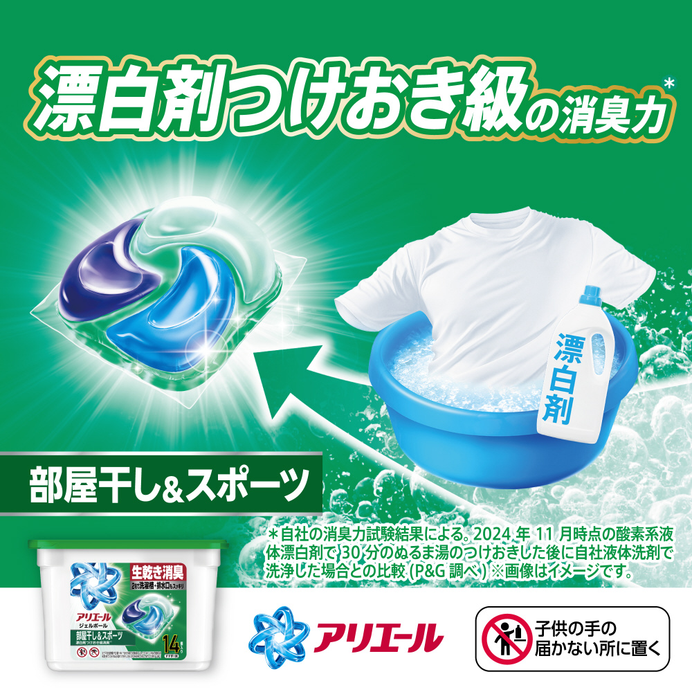 部屋干し&スポーツ 漂白剤つけおき級消臭*2※ 漂白剤・つけ置きなしで洗ってアリエールの力を実感!*3