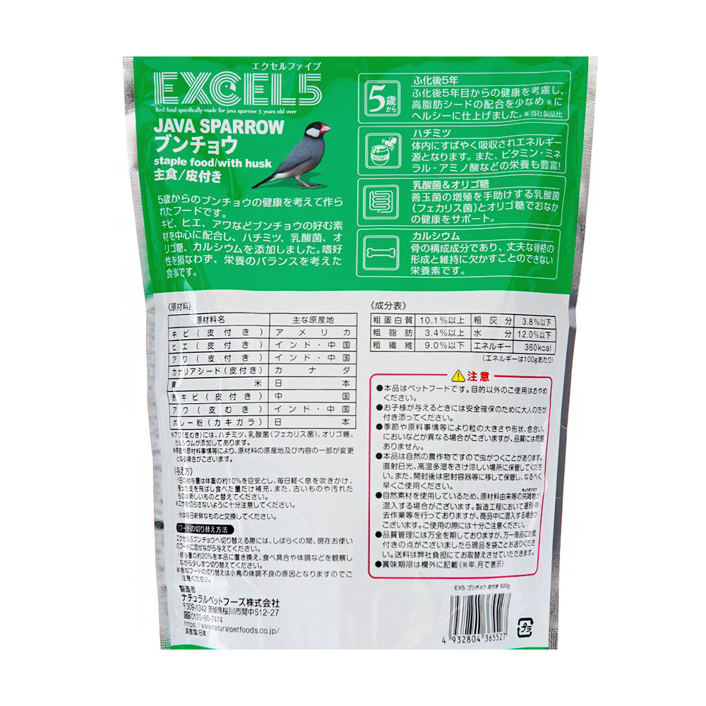 ●5歳からのブンチョウの健康を考えて作られたフードです。●ブンチョウの好む素材を中心に配合し、ハチミツ、乳酸菌、オリゴ糖、カルシウムを添加しました。●嗜好性を損なわず、栄養のバランスを考えた食事です。