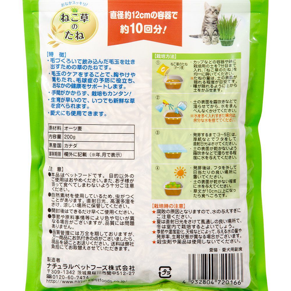 ●毛づくろいで飲み込んだ毛玉を吐き出すための草のたねです。●毛玉のケアをすることで、胸やけや胃もたれ、毛球症の予防に役立ち、お腹の健康をサポートします。●生育が早いので、いつでも新鮮な草を食べられます。●手間がかからず、栽培もカンタンです。●愛猫だけでなく愛犬にも使用できます。