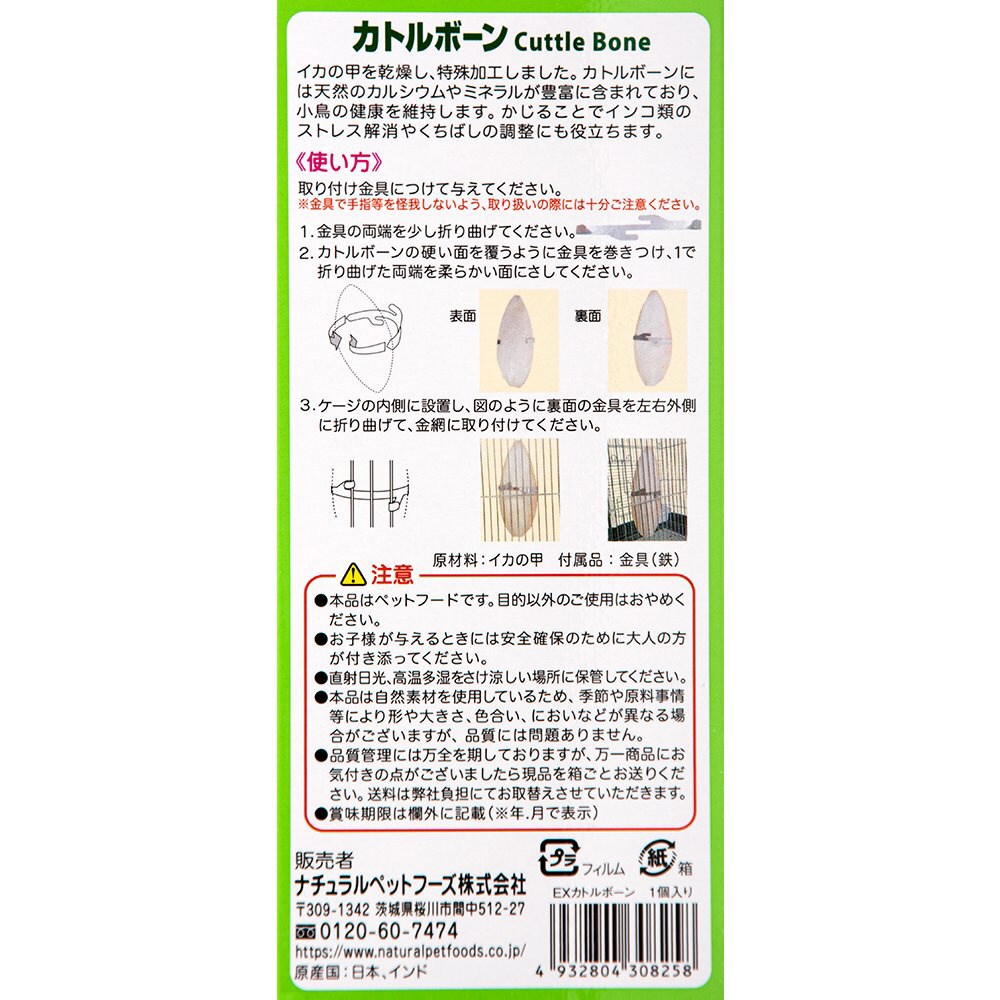 ●小鳥のための栄養補助食です。●イカの甲を乾燥し、特殊加工しました。●天然のカルシウムやミネラルが豊富に含まれています。●かじることでインコ類のストレス解消やくちばしの調整にも役立ちます。●便利な取付け金具付きです。