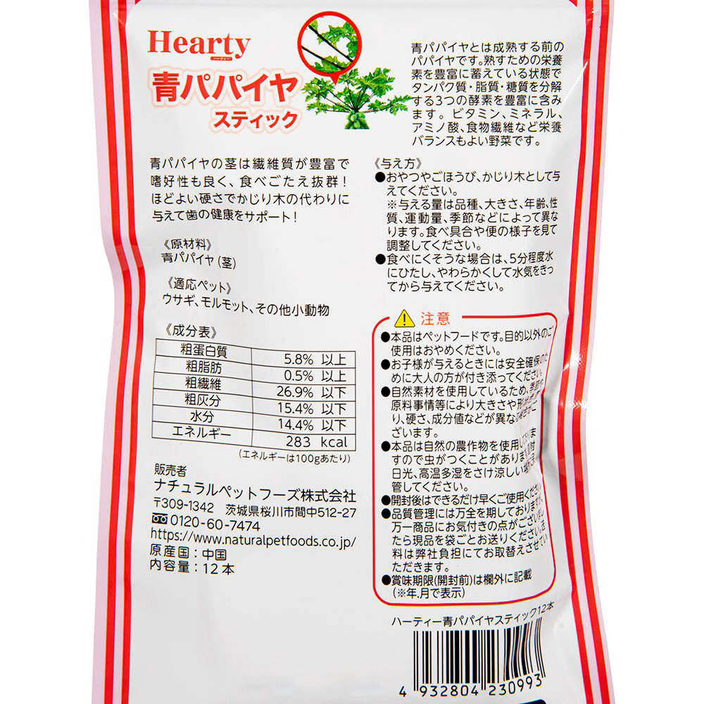 ●タンパク質・脂質・糖質を分解する3つの消化酵素を含む青パパイヤの茎をそのまま乾燥しました。●青パパイヤの茎は繊維質が豊富でし好性も良く、食べ応え抜群、ほどよい固さでかじり木の代わりに与えて歯の健康をサポートします。