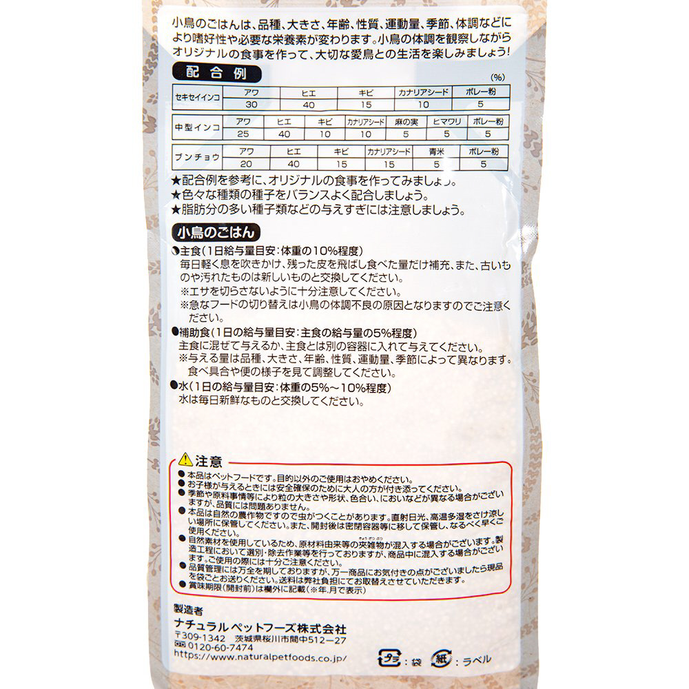 ※本品は鳥用フードです。目的以外のご使用はおやめください。※季節や原料事情等により粒の大きさや形状、色合い、においなどが異なる場合がございますが、品質には問題ありません。※本品は自然の農作物ですので虫がつくことがあります。直射日光、高温多湿をさけ涼しい場所に保管してください。また、開封後は密閉容器等に移して保管し、なるべく早くご使用ください。