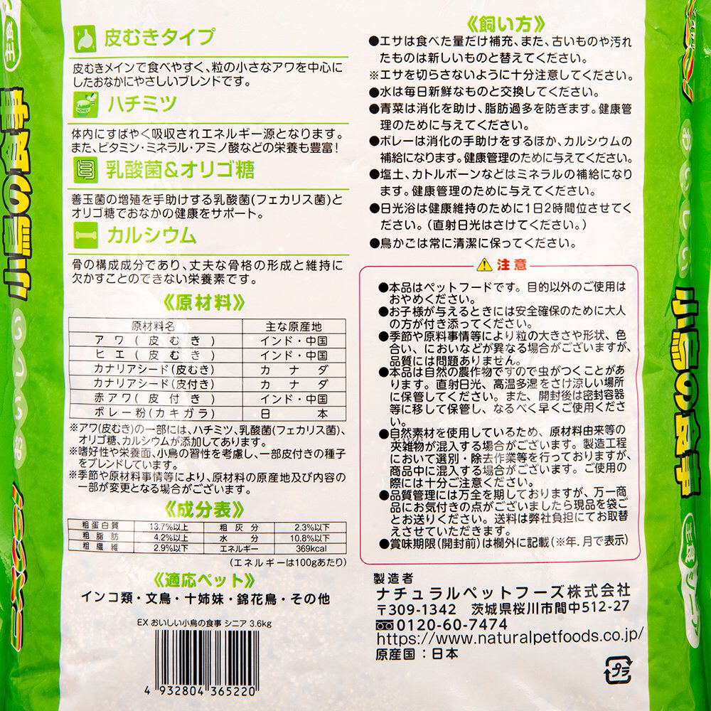 ●年齢と共に健康が気になりだした小鳥に合わせて厳選された新鮮な種子をバランスよく配合しました。●小鳥の健康を考え、ハチミツ・乳酸菌・オリゴ糖・カルシウムをプラス!食べやすさとおなかに配慮したシニアタイプです。●消化が気になる小鳥にもおすすめです。