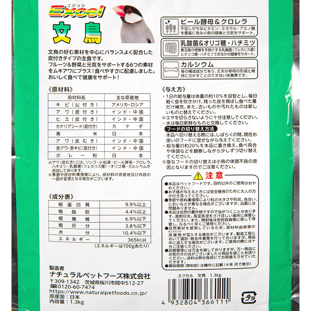 ■キビ(皮付き)、アワ(皮付き)、ヒエ(皮付き)、カナリアシード(皮付き)、青米、アワ(皮むき)、赤アワ・赤キビ(皮付き)、ボレー粉、※アワ(皮むき)には、リンゴ・小松菜・ビール酵母・クロレラ、ハチミツ・乳酸菌(フェカリス菌)・オリゴ糖・カルシウムが添加してあります。