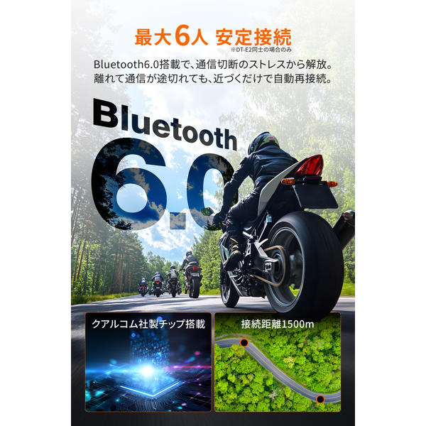DT-E2同士なら最大で6人同時通話に対応。Bluetooth6.0搭載で、安定した通信を維持します。離れて通信が途切れても、近づくだけで自動再接続。