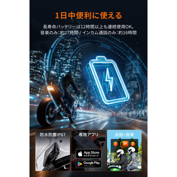 インカム通話と音楽再生を同時に楽しめる。ノイズが少なくインカム通話も音楽も聞き取りやすい。