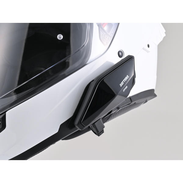 ヘルメットに面ファスナーを貼り付け、本体を取り付け。操作性が良く、厚さを抑えてスリムに装着。