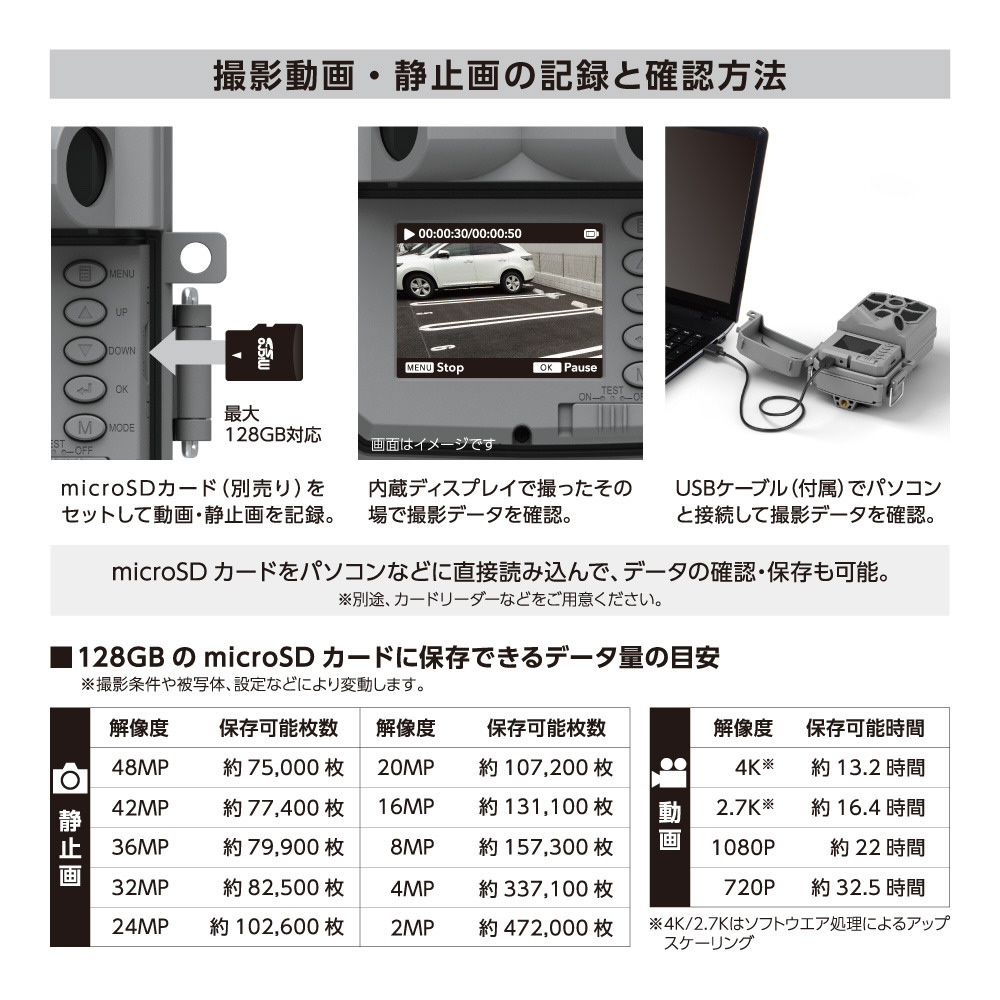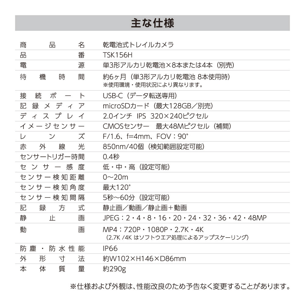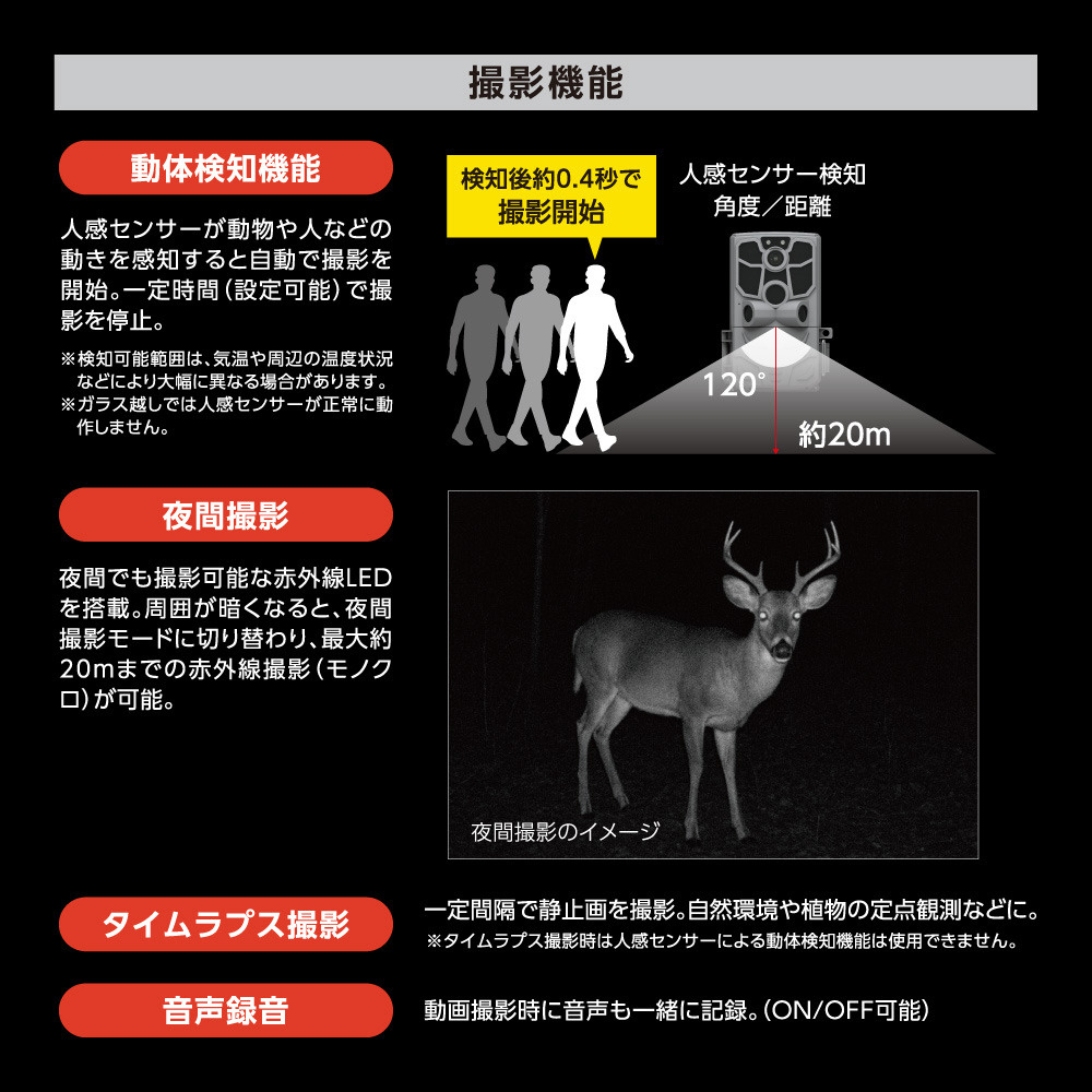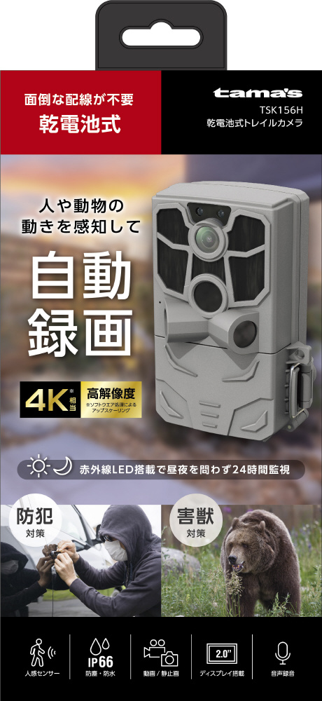 ●乾電池で動作するため外部電源などは不要です。外部電源が必要な通常の防犯カメラと比較して設置がとても簡単です。 ●単3形乾電池8本で最大約180日記録可能。 ※単3形乾電池4本でも動作は可能です。 ●静止画4800万画素、動画は最大4K相当(ソフトウェア処理によりアップスケールした値)で高画質撮影できるので対象の細部まで撮影が可能。 ●広範囲人感センサーを3個搭載しているため、周囲と温度差のある人や 動物の動きを自動検出し、すばやく録画を開始します。