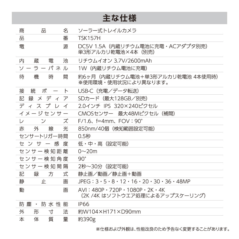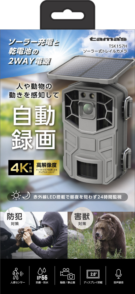 ●一体型のソーラーパネルに内蔵の2600mAhリチウム電池で長時間の待ち受けに対応。※最長目安約6か月 外部電源が不要なので電源が取れない駐車場や庭、倉庫などの監視に最適。不審者の侵入やいたずらの証拠を記録。 ●ソーラー・内蔵バッテリーの他に単3形アルカリ乾電池4本でも動作します。悪天候が続いた時や日照時間が少ないときでも記録を取り続けます。 リチウム充電池が苦手な低温時でも乾電池なら作動可能です。※内蔵リチウムバッテリーの容量が少なくなると自動的に乾電池に切り替わります。