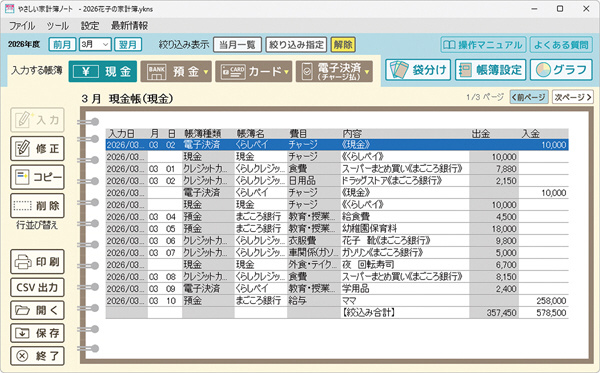 収支も自動計算され、記録データの修正もかんたんに行えます。