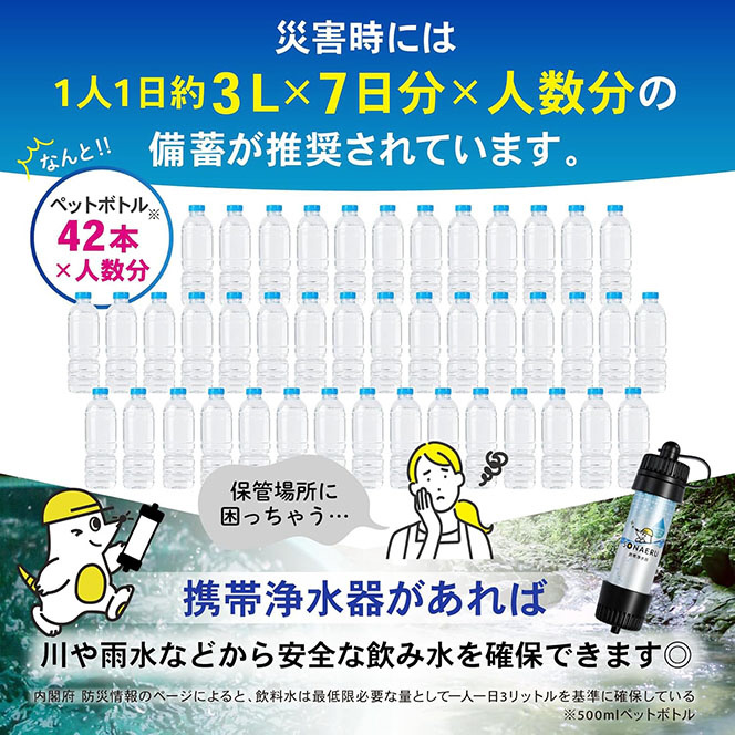 携帯浄水器本体は手のひらサイズの軽量設計。防災リュックやバッグにすっきり収まり、移動時の負担にもなりません。折りたたみ式のウォーターバッグは収納性も高く、アウトドア用途にも最適。