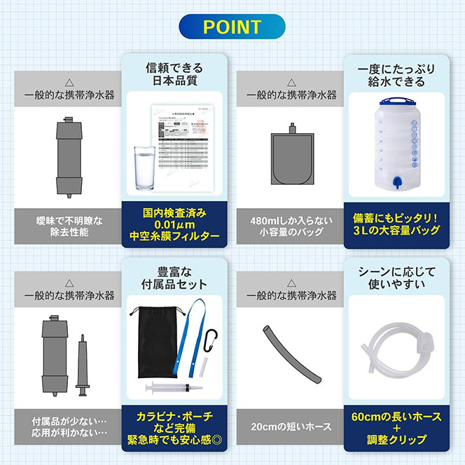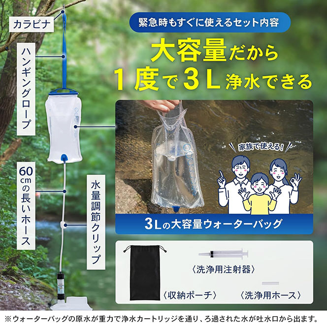 セットには、携帯浄水器本体(フィルター内蔵)に加え、3Lの大容量ウォーターバッグ、長さ60cmの吸水ホース、水量調整クリップを同梱。