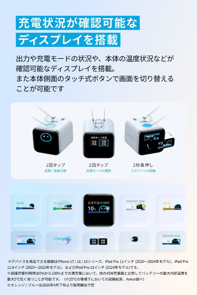 最大45W出力で最新のiPhoneを急速充電。充電状況を確認できるディスプレイやスイングプラグを搭載したAnker初のモデル検知対応充電器