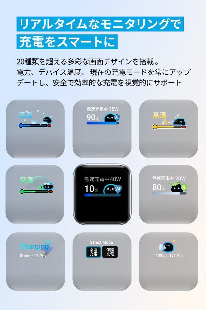 20種類を超える多彩な画面デザインを搭載 。電力、デバイス温度、 現在の充電モードを常にアップデートし、安全で効率的な充電を視覚的にサポート