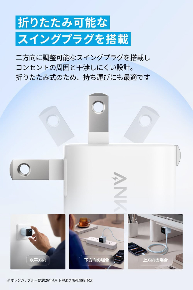 二方向に調整可能なスイングプラグを搭載しコンセントの周囲と干渉しにくい設計。 折りたたみ式のため、持ち運びにも最適です