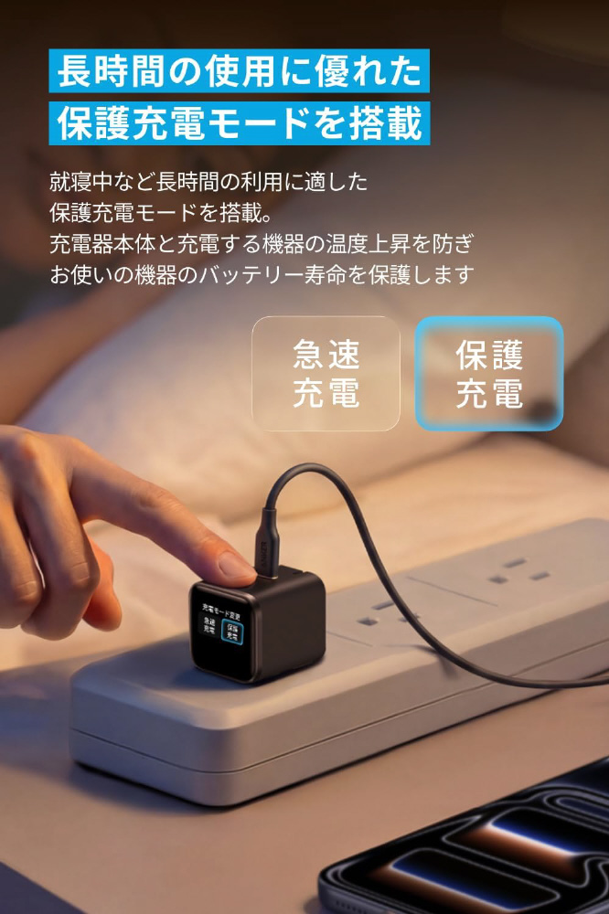 就寝中など長時間の利用に適した保護充電モードを搭載。 充電器本体と充電する機器の温度上昇を防ぎお使いの機器のバッテリー寿命を保護します