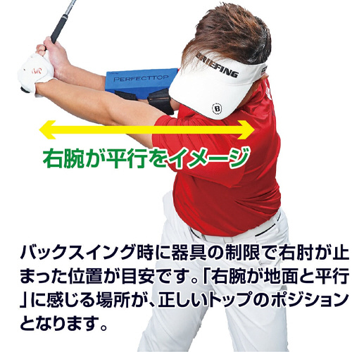 そのままバックスイングを行うだけで器具の制限により、左腕が地面と平行になる「理想的なトップの位置」を自然に体感することができます。