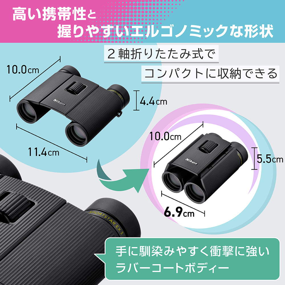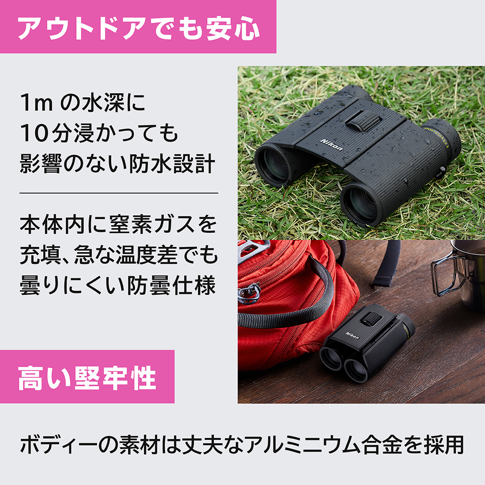 気軽に持ち運べる、軽量コンパクトな2軸折りたたみ方式双眼鏡。 雨天時も安心な防水仕様。