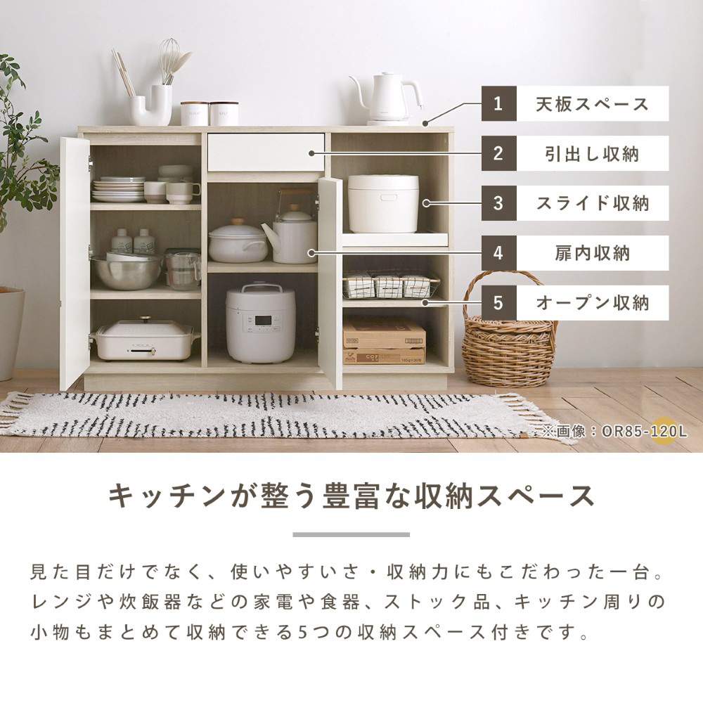 見た目だけでなく、使いやすさ・収納力にもこだわった一台。レンジや炊飯器などの家電や食器、ストック品、キッチン回りの小物もまとめて収納できる5つの収納スペース付きです。